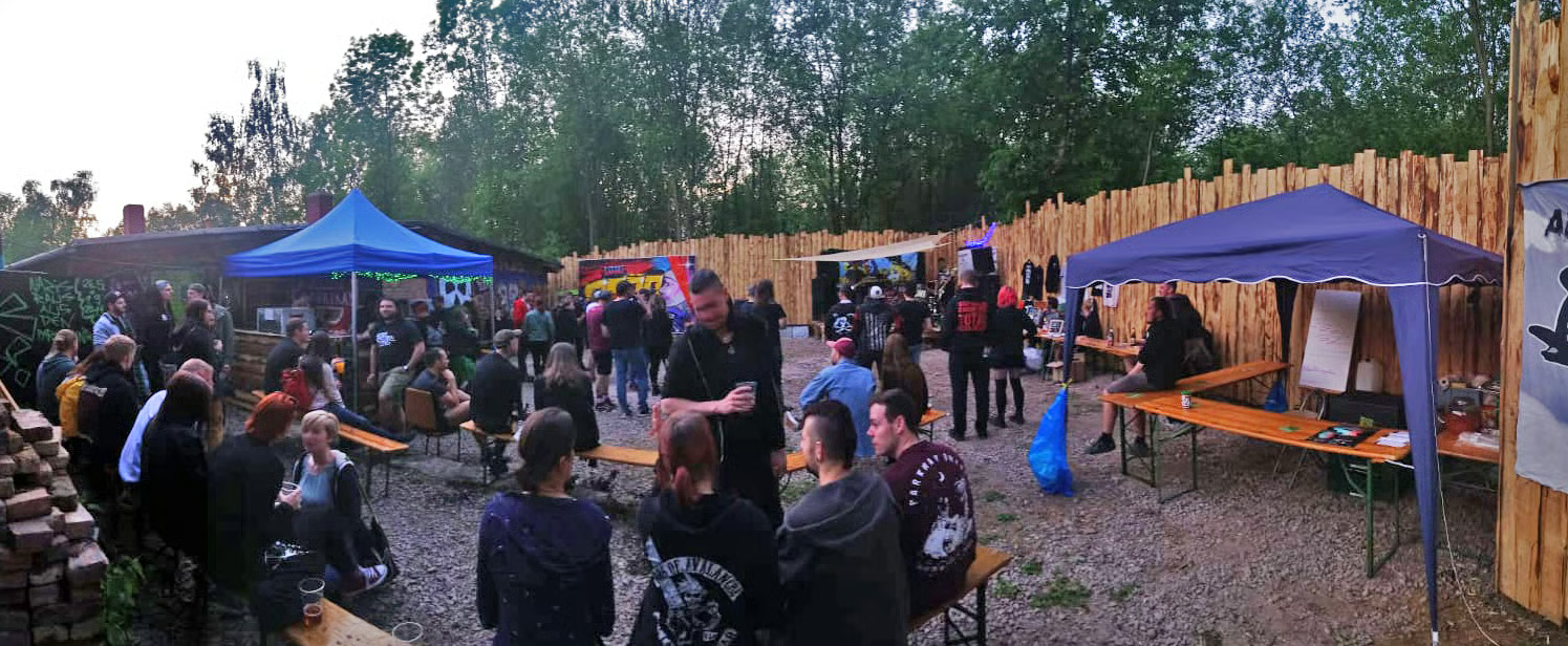 ... Aus einigen Paletten haben wir eine Bar zusammengeschraubt. (Damals war sowas voll im Trend) Da sie bis heute immer noch verdammt gut hält, haben wir den Plan überworfen, irgendwann mal eine "richtige" Bar zu bauen. Schon nach einigen Wochen war uns klar, dass der Konzertraum zu klein ist, denn auch hier kamen sehr schnell viele Menschen zusammen. So wurde dann kurzerhand eine Wand rausgerissen, der Boden nochmal ausgebessert, Teppich reingelegt und seit 2015 schwingen wir unser Tanzbein über diesen Boden. Die Reichenbacher Straße 109 in Zwickau ist abgelegen und in ruhiger Kleingartenidylle. Aber nicht zu ruhig. Denn neben Kleinkünstler_innen und Newcomern kommen hier auch Bands vorbei, die sonst große Bühnen füllen. Immer wieder überraschen wir unsere Gäste und uns mit neuen Künstler_innen, die die Hütte in Flammen stecken. (Bild Kravbocca) So rennt während des Konzertes auch einfach mal die Sängerin oder der Gitarrist durchs Publikum. Das sind echte Stars zum Anfassen. Bei einer Bühne, die keinen halben Meter hoch ist, bleibt noch so jedes abrockende Bandmitglied gezwungen bodenständig zu bleiben. Nur beim Stagediven hält einen die niedrige Decke davon ab abzuheben. Alles in allem ein kompakter Konzertraum, der wenig Platz aber viel Freiraum bereithält. 2020 kam dann die Corona-Zwangspause, welche alle Bereiche hart getroffen hat. Auch wir mussten geplante Konzerte, Lesungen und unsere Festivals absagen. Aber wir nutzten die Zeit um den Bereich hinter der Barrikade aufzuhübschen. Wir bauten einen gigantischen Zaun für unsere Festung. Außerdem zimmerten wir eine Überdachung und eine Außenbar zusammen. So entstand in wenigen Monaten ein toller Biergarten, welcher uns nun für immer mehr Freiluft-Konzerte bereitsteht. Mit ihm war die Arbeit an unsere Sommerresidenz vorerst vollendet, denn nun begann der Umbau unserer neuen Vereinsräume, im Vendetta Rosso.